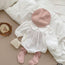 Baby Girl Muslin Cotton Full sleeves romper in a beautiful shade of Pink & White. Made of 100% muslin cotton .This romper has a baggy fit. The White Collar has tiny floral embroidery.
